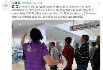 El Instituto Nacional de Migración (INM) informó que, de diciembre de 2018 a noviembre de 2019, tiene registro de 207,741 personas mexicanas repatriadas provenientes de Estados Unidos y Canadá, de las cuales cerca de 95 % cuentan con escolaridad básica, media o superior y 99% poseen experiencia laboral.