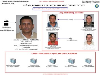 Antes de entregarse, Súñiga fue identificado por la Oficina de Control de Activos Extranjeros (OFAC) del Departamento del Tesoro de EEUU como líder de “Los Pochos”, una organización internacional de trasiego de cocaína con sede en Guatemala.