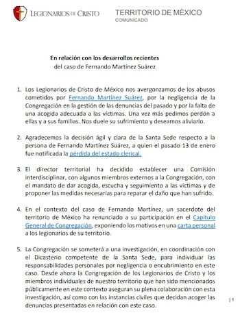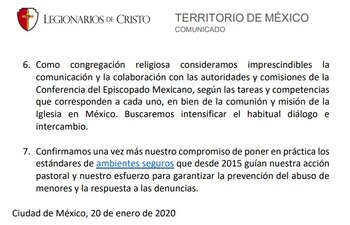 El 21 de diciembre de 2019, la poderosa congregación religiosa admitió en un informe interno que al menos 175 menores de edad fueron víctimas de abusos sexuales cometidos por miembros de Legionarios de Cristo entre 1941 y 2019, 60 de ellos por su fundador Marcial Maciel.