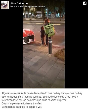 Fue un usuario de nombre Alan Calderón el que compartió la fotografía en su perfil de Facebook y escribió lo siguiente: “Algunas mujeres se la pasan lamentando que no hay trabajo, que no hay oportunidades para mamás solteras, que nadie les cuida a los hijos y victimizándose por los hombre que ellas mismas eligieron. Otras simplemente lucha y triunfan. Bendiciones para ti si lo llegas a ver”.