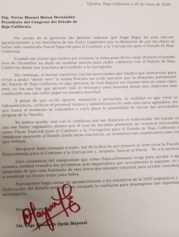“No quiero quedar mal con la confianza que me dispensó el gobernador del estado ni con el Poder Legislativo, motivo por el cual he decidido presentar mi renuncia irrevocable como Fiscal Especial para el Combate a la Corrupción del Estado de Baja California y continuar apoyando desde otras trincheras”, explicó en la carta.