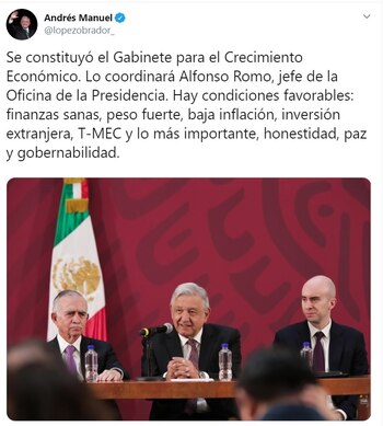 "Hoy (miércoles) tengo una reunión del gabinete ampliado porque se va a decidir la creación de un gabinete para el fomento a inversiones y el crecimiento económico. Y se va a nombrar a un coordinador de todo el gabinete: Alfonso Romo", dijo en su tradicional conferencia matutina.