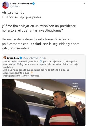 Igualmente la senadora de Morena, Citlali Hernández, se sumó a las descalificaciones de Levy al retuitear sus declaraciones, sin corroborarlas y además, agregar que el señor se había bajado del avión por pudor: “¿Cómo iba a viajar en un avión con un presidente honesto si el trae tantas investigaciones?. Así la 4T.