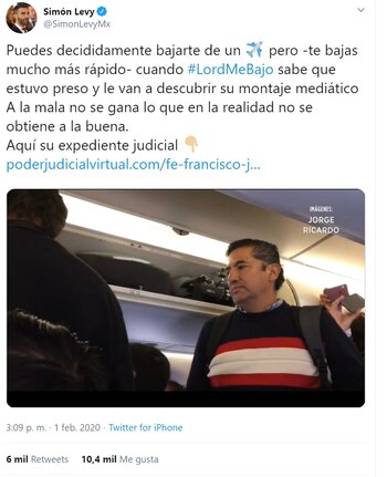 El señalamiento por parte de Levy fue el siguiente: “Cuando #LordMeBajo sabe que estuvo preso y le van a descubrir su montaje mediático. A la mala no se le gana lo que en la realidad no se obtiene a la buena. Aquí su expediente judicial”.