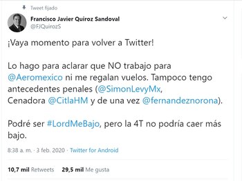 A través de un sencillo, pero contundente tweet, Francisco Javier Quiroz Sandoval respondió a las descalificaciones y argumentos sin sustento que presentaron en días pasados Simón Levy y Citlali Hernández. En éste aprovechó también para responder a las acusaciones del político Gerardo Fernández Noroña, quien mencionó que Quiroz era auditor externo de Aeroméxico, es decir, dio la cara ante sus detractores.