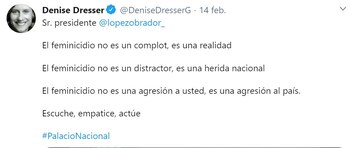 Mientras que en otro tuit escribió: “El feminicidio no es un complot, es una realidad. El feminicidio no es un distractor, es una herida nacional. El feminicidio no es una agresión a usted, es una agresión al país. Escuche, empatice, actúe”
