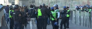 Mujeres policías de la Secretaría de Seguridad Ciudadana resguardan la puerta Mariana del Palacio Nacional para evitar que sean vandalizadas.