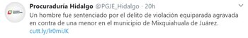 La Procuraduría General de Justicia del estado de Hidalgo (PGJEH) obtuvo sentencia condenatoria de nueve años y cuatro meses, en contra de una persona por el delito de violación equiparada agravada.