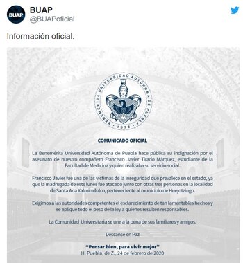 Ambas universidades a las que asistían los jóvenes de no más de 25 años sentenciaron los acontecimientos. Por su parte la BUAP escribió: