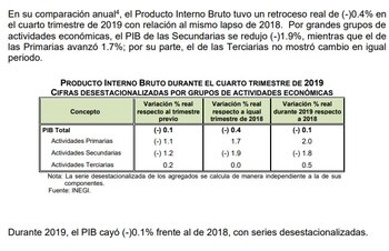 El Producto Interno Bruto (PIB) se contrajo 0.1% en 2019 confirmó este martes el Instituto Nacional de Estadística y Geografía (Inegi).