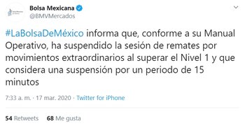 “#LaBolsaDeMéxico informa que, conforme a su Manual Operativo, ha suspendido la sesión de remates por movimientos extraordinarios al superar el Nivel 1 y que considera una suspensión por un periodo de 15 minutos”, dijo la BMV en su cuenta de Twitter.