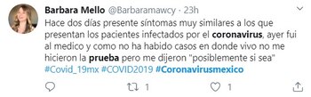 “Estuvo en España haciendo un pequeño proyecto, así que cuando regresé a México consideré prudente hacerme una prueba”, contó en declaraciones a Grupo Fórmula. “Ya después de 25 llamadas en la noche me contestaron y me dijeron que sólo podían atender a pacientes que habían estado en China o Italia”, explicó entonces.