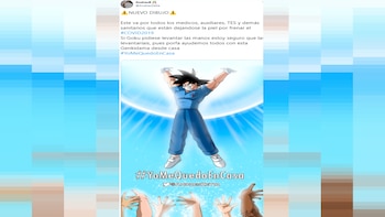 Horas antes, también compartió una imagen realizada por un fanático ilustrador de nombre Andrés Zetta en la que vemos al legendario protagonista de la saga Dragon Ball, pero vestido como enfermero, con cubrebocas, una Genkidama entre las manos y personas ayudándolo a cumplir su cometido.