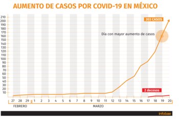 En México el número de casos de COVID-19 aumentó a 203, reportó la Secretaría de Salud, instancia que confirmó la muerte de un hombre de 74 años en el estado de Durango el jueves y que se debió a esta nueva cepa.
