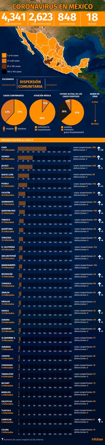 En México, el número de casos de personas infectadas por Covid-19 aumentó a 848, al tiempo que la cifra de víctimas fatales llegó a 18, hay 2,623 pacientes sospechosos y 4,341 casos fueron negativos.