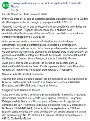 Los días 19, 20, 23 y 24 de marzo de este año, el gobierno capitalino había publicado en la Gaceta Oficial diversos instrumentos encaminados para los fines a que se refiere el considerando anterior, la suspensión de términos y plazos en procedimientos administrativos y trámites que se realizan en las dependencias, órganos desconcentrados, entidades de la administración pública y las alcaldías de la Ciudad de México; la suspensión temporal de actividades de establecimientos mercantiles y centros educativos, así como de eventos públicos y privados con aforo mayor a 50 personas.