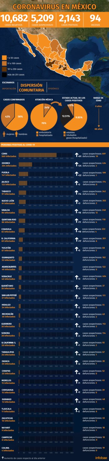 López-Gatell señaló que la Ciudad de México es la entidad con el mayor número de casos positivos (560) y de fallecidos (19). Estos últimos se concentran en adultos mayores y con enfermedades previas.