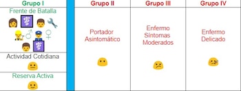 Los grupos rojos (II, III y IV) son los grupos de personas contagiadas. Estos grupos tienen que mantener el ánimo, seguir las indicaciones médicas, tener paciencia y saberse apoyados por todos los demás.