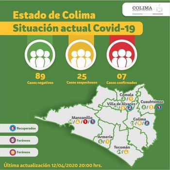 En el estado de Colima solo han sido confirmados siete casos de coronavirus en todo el estado, los cuales se encuentran en Manzanillo (2), Villa de Álvarez (2), Colima (2) y Cuauhtémoc (1). Hay 25 personas con sospechas de la enfermedad y 89 han resultado negativos en sus pruebas.