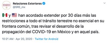 La Secretaría de Relaciones Exteriores (SRE), por su parte, anunció en Twitter que Estados Unidos y México extendieron las restricciones a todo el tránsito terrestre no esencial en su frontera común.