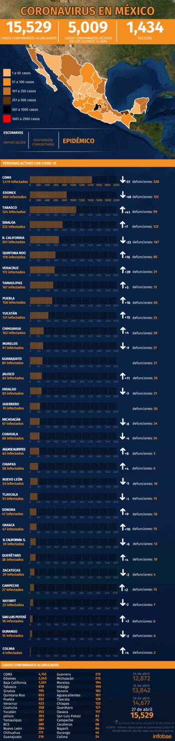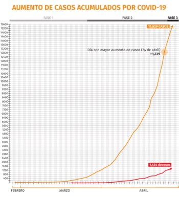 El último reporte de la Secretaría de Salud (SSa), sobre el avance del virus SARS-CoV-2 en el territorio nacional, actualmente se han contabilizado 15,529 positivos y los decesos se ubicaron en 1,434.