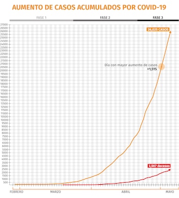En México, el número de casos de personas infectadas por COVID-19 aumentó a 26,025 pacientes confirmados, 1,120 nuevos positivos, reportó la Secretaría de Salud (SSa). Mientras que la cifra de víctimas fatales creció a 2,507, el pico de muertos más alto hasta ahora en un periodo de 24 horas: 236 fallecimientos.