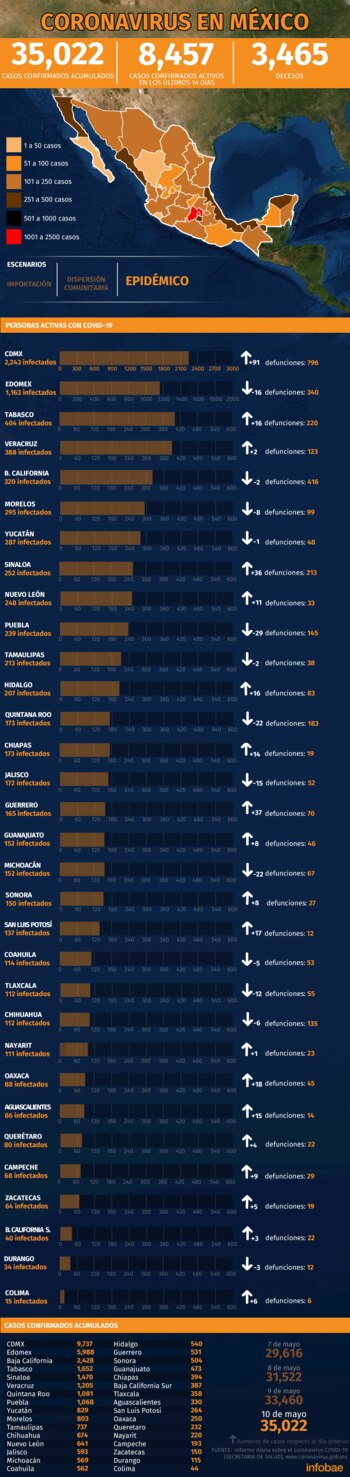 Los casos confirmados de Covid-19 México ya suman 35,022 (1,562 más que en la jornada anterior) mientras que la cifra de fallecidos a causa de esta enfermedad alcanzó los 3,465 (un incremento de 112 en las últimas 24 horas), así lo informaron la noche del domingo las autoridades de salud.