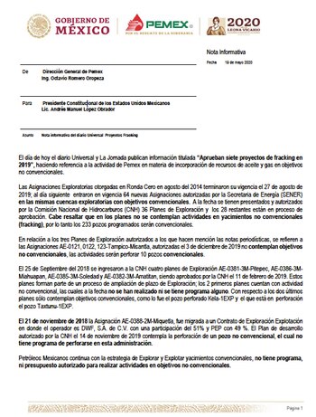 En relación a los tres Planes de Exploración autorizados a los que hacen mención las notas periodísticas, se refieren a las Asignaciones AE-0121, 0122, 123-Tampico-Misantla, autorizadas el 3 de diciembre de 2019 no contemplan objetivos no convencionales, las actividades serán perforar 10 pozos convencionales".
