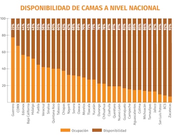 No obstante, en la Ciudad de México únicamente se cuenta con una capacidad del 23% del total de camas de hospitalización general ante un 77% de ocupación. En cuanto a la atención con ventiladores, dicha entidad tiene un 62% de espacios llenos y 38% de disponibilidad.