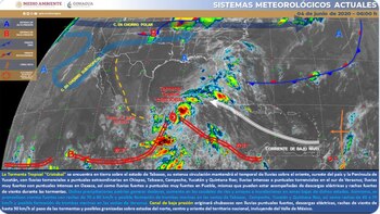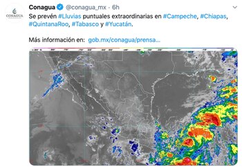 El Servicio Meteorológico Nacional (SMN) de la Comisión Nacional del Agua (Conagua), en coordinación con el Centro Nacional de Huracanes de Miami, Estados Unidos de América, mantiene zona de vigilancia por efectos de tormenta tropical desde Coatzacoalcos, Veracruz, hasta Campeche, Campeche.