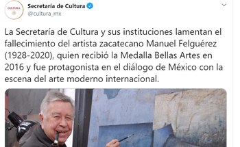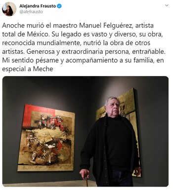 “Anoche murió el maestro Manuel Felguérez, artista total de México. Su legado es vasto y diverso, su obra, reconocida mundialmente, nutrió la obra de otros artistas. Generosa y extraordinaria persona, entrañable. Mi sentido pésame y acompañamiento a su familia, en especial a Meche”.