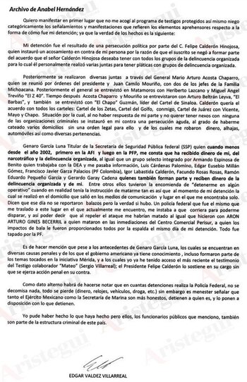 Contó que gracias a un diario que obtuvo de Vicente Zambada Niebla, pudo dar a conocer que “la Policía Federal era brazo armado del Cártel de Sinaloa 2008, 2009, 2010, 2011, 2012, durante estos años del sexenio de Felipe Calderón”.
