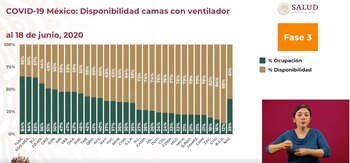 Dentro de la disponibilidad de camas para hospitalización general, en la Ciudad de México hay un 70% de ocupación, en el Estado de México un 68%, y en Guerrero un 57 por ciento. En las camas con ventilador, para los pacientes más críticos, Tlaxcala registró un 64% de ocupación, el Estado de México un 64%, y Baja California un 63 por ciento.