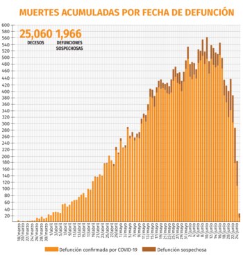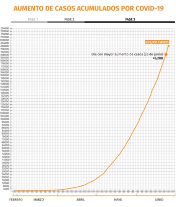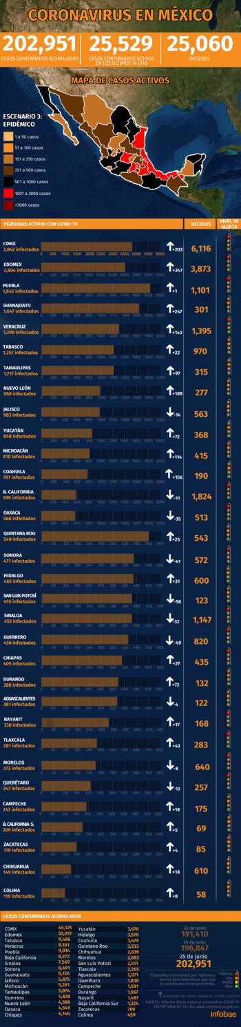 La Secretaría de Salud (Ssa) informó que hasta el momento, se han registrado en México 202,901 casos confirmados acumulados y 25,060 defunciones desde finales de febrero, cuando se encontró el primer positivo.