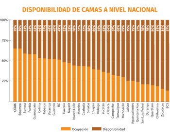Las entidades con mayor ocupación hospitalaria son Ciudad de México (65%), Estado de México (65%) y Sonora (59%). Mientras que las que tienen mayor disponibilidad para pacientes graves que requieren intubación son Baja California Sur (87%), Chihuahua (86%) y Zacatecas (85%).