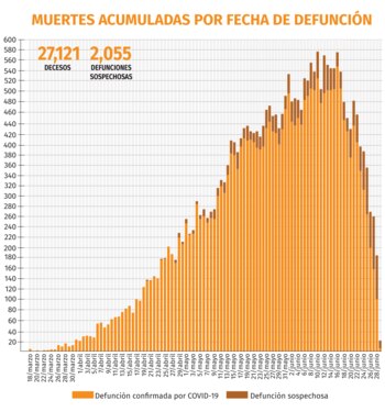 Según los conteos oficiales, las cinco entidades más afectadas, en relación a las personas que han fallecido por la enfermedad, son la Ciudad de México a la cabeza, seguida del Estado de México (4,200), Baja California (1,899), Veracruz (1,522), Sinaloa (1,257), Puebla (1,241) y Tabasco (1,032).