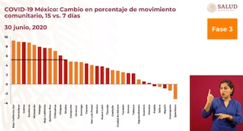Baja Califronia Sur, Tamaulipas, Colima. Zacatecas, Michoacán, Hidalgo, Baja California, Quintana Roo, Chihuahua, Chiapas y Sinaloa incrementaron su movilidad, de acuerdo con el doctor Ricardo Cortés Alcalá. Estos indicadores son compartidos por Google, Facebook y Twitter y se presentan cada martes en la conferencia de la Secretaría de Salud.
