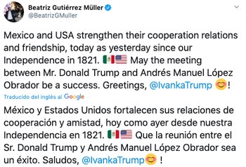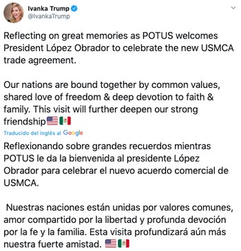 “México y Estados Unidos fortalecen sus relaciones de cooperación y amistad, hoy como ayer desde nuestra Independencia en 1821(año en el que se decretó formalmente con la firma de los tratados). Que la reunión entre Donald Trump y Andrés Manuel López Obrador sea un éxito. Saludos @IvankaTrump”.