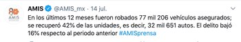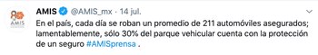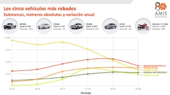 Por otra parte, la AMIS informó que entre julio del año pasado y junio del 2020 fueron robados 77,206 vehículos ligeros asegurados en México, es decir un promedio de 211 por día.