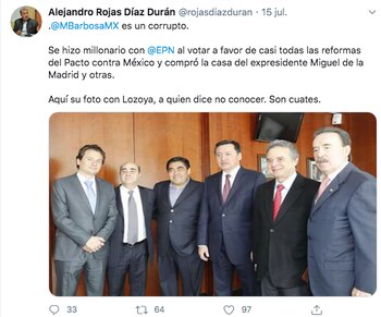 Sin embargo, otro integrante de su partido, Alejandro Rojas Díaz Durán, le contestó con fotografía en la que parece en compañía de Emilio Lozoya. Además con él se encontraban Jesús Murillo Karam, Miguel Ángel Osorio Chong, Pedro Joaquín Coldwell, Emilio Gamboa, algunos de ellos señalados también entre las relaciones del ex titular de Pemex.