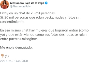 “Son 20,000 personas que rolan packs, nudes y fotos sin consentimiento. En ese mismo chat hay mujeres que lograron entrar (como yo) y están viendo cómo sus fotos desnudas, se rolan entre puercos misóginos. Me enoja demasiado”.