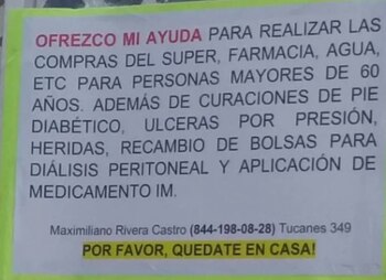 Otro caso loable es el de un joven estudiante de medicina que colocó un letrero afuera de su domicilio en el cual ofrece hacer mandados y curaciones a personas de la tercera edad, para que no salgan de sus casas.