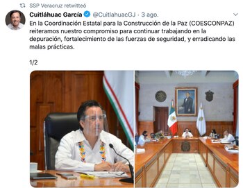 “En la Coordinación Estatal para la Construcción de la Paz (COESCONPAZ) reiteramos nuestro compromiso para continuar trabajando en la depuración, fortalecimiento de las fuerzas de seguridad, y erradicando las malas prácticas”, escribió.