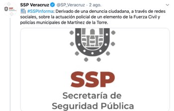 Posteriormente la Secretaría de Seguridad Pública de Veracruz (SSP) informó que suspendió al policía que fue captado en el video, esto luego de que miles de usuarios arrobaran a la Fiscalía y al mismo presidente Andrés Manuel López Obrador denunciando el hecho.