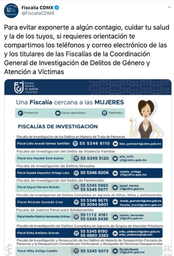 La Fiscalía General de Justicia de la Ciudad de México, informó que pone a disposición de la ciudadanía los números telefónicos (55) 5200 9000 y 800 745 2369 para orientación jurídica gratuita.