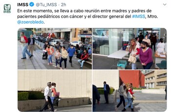 Por su parte, a través de su cuenta de twitter, @zoerobledo, respondió: Respecto a la solicitud de madres de niñas y niños con cáncer que se atienden en el Centro Médico Nacional La Raza de @Tu_IMSS, acordamos que mañana temprano las recibiré para una reunión de trabajo resolutiva”.
