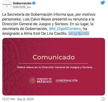 La Secretaría de Gobernación informó que, por motivos personales, Luis Calvo Reyes presentó su renuncia a la Dirección General de Juegos y Sorteos, a partir del 16 de septiembre próximo.