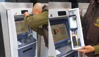 Policías de seguridad privada grabaron el momento en el que descubren y retiran un celular dentro de una lámina en la parte superior del cajero automático con el que graban el número de tarjeta y el NIP(número de identificación personal), presuntamente para la clonación de tarjetas.