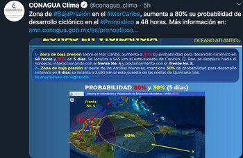Este día, el frente No. 4 permanecerá como estacionario sobre la Península de Yucatán e interaccionará con una onda tropical y una zona de baja presión con alta probabilidad de desarrollo ciclónico que se ubicará frente a las costas de Quintana Roo; estas condiciones originarán lluvias puntuales extraordinarias en ese estado, así como intensas a torrenciales acompañadas de descargas eléctricas en el sureste de México y sobre la Península de Yucatán.