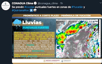 Rachas de viento de 70 a 80 km/h y oleaje de 2 a 4 metros de altura significativa en las costas de Yucatán, Quintana Roo y occidente del Mar Caribe.